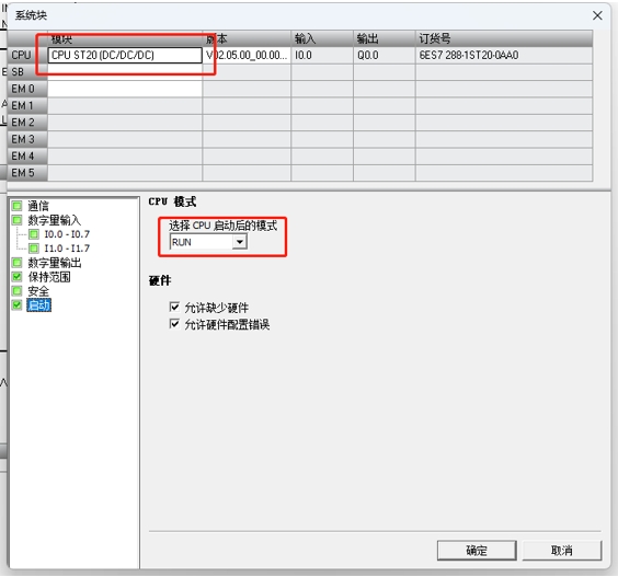 2、系统块设置好对应plc型号以及勾选启动模式为run
