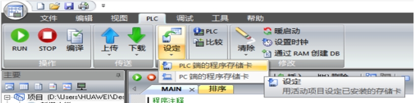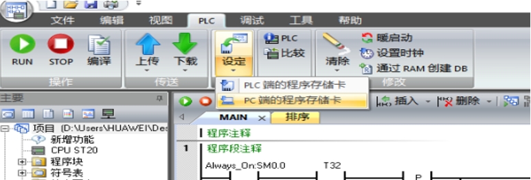 3、栏目上方依次选择 plc—设定PC端的程序储存卡