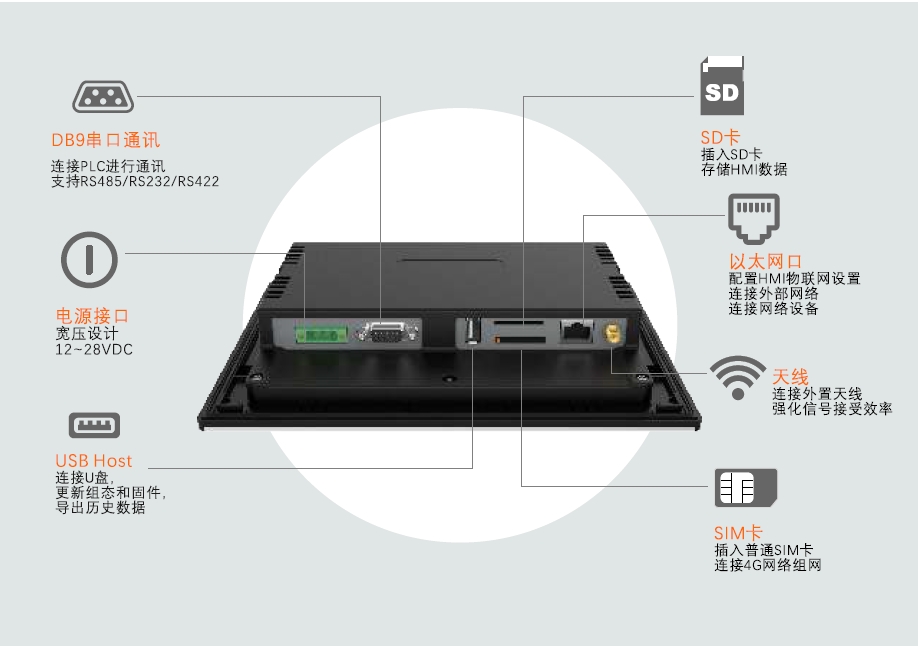 USB Host USB2.0 x 1, Type A(USB1),支持U盘更新固件、组态和存储数据